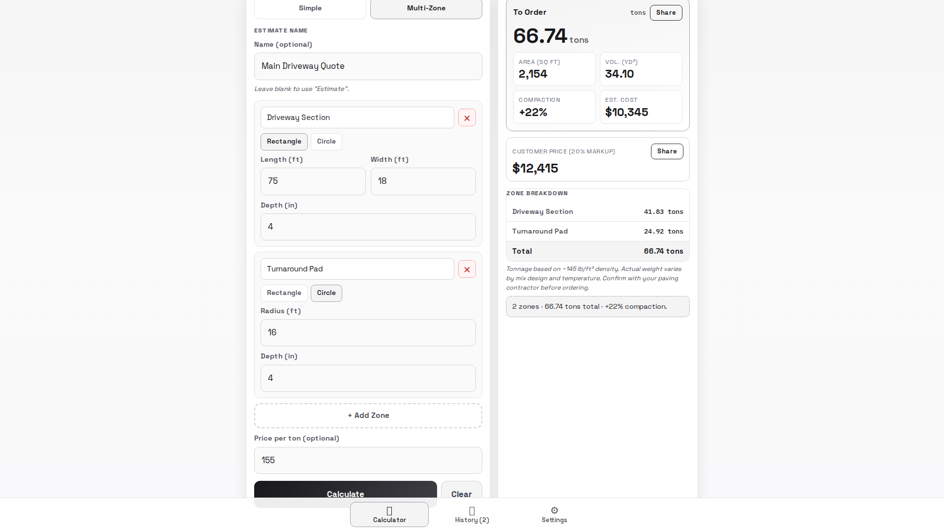 Multi-Zone mode is built for more detailed jobs where surfaces are split into sections with different shapes and dimensions. You can break down complex paving areas into manageable parts, then roll those values into a single total for ordering and quoting. That makes it easier to handle irregular layouts and phased work while keeping the estimate organized and easy to explain.